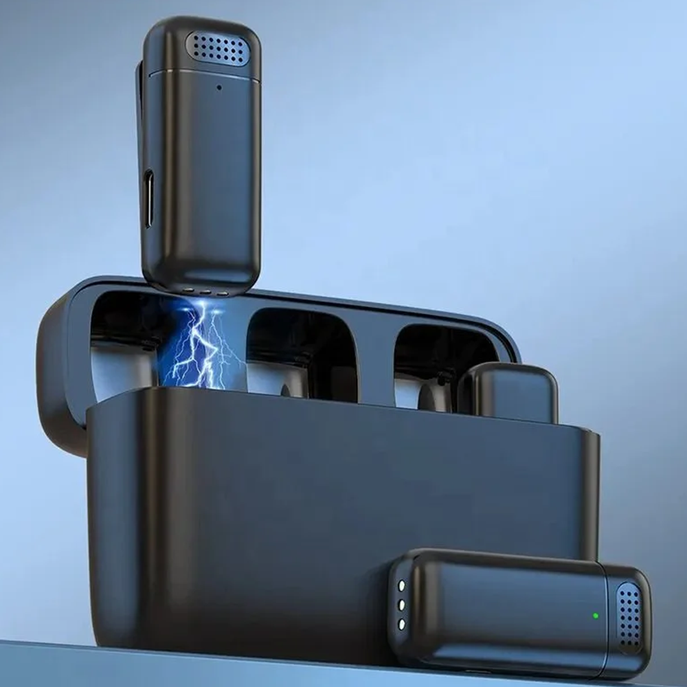 The updated wireless lavalier microphone carries a charging case for storing the microphone and receiver, also a place to charge the microphone. The fully charged storage case can charge 3-4 times for 2 microphones at the same time and each microphone can work for about 6 hours per charge. Its lightweight design allows you take it around (only 2.24oz/63.5g.)